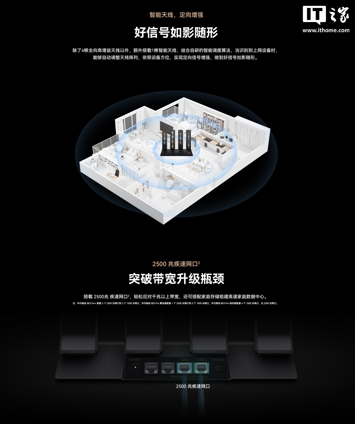据介绍,这款路由器相对于此前的 BE3 Pro 主要就是改用为 2 个 2.5G 网口、2 个千兆网口。其整体采用黑色外观设计,匹配 4 根全向高增益天线和 1 根智能天线。支持端游手游加速和儿童上网保护。