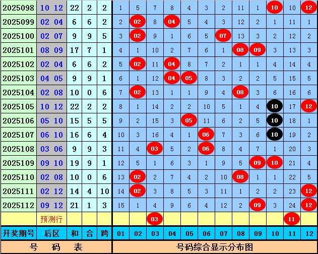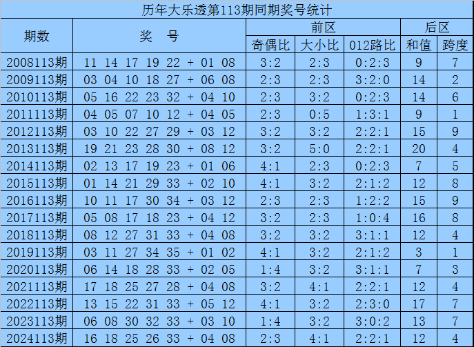 后区分析:在第113期历史同期开奖中,和值大小为7:10,跨度奇偶比为9:8,本期后区注意两码03和11。
