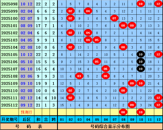 后区号码分析:在第113期历史同期开奖中奖,奖号04 08出现6次,奖号12出现5次,奖号01 02 03 05 10出现3次,奖号06出现2次,奖号07 09 11没有出现。本期后区五码参考03、05、08、10、12。