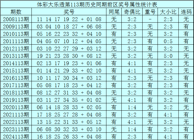 体彩大乐透第113期历史同期开出17次奖号,其统计详见下表: