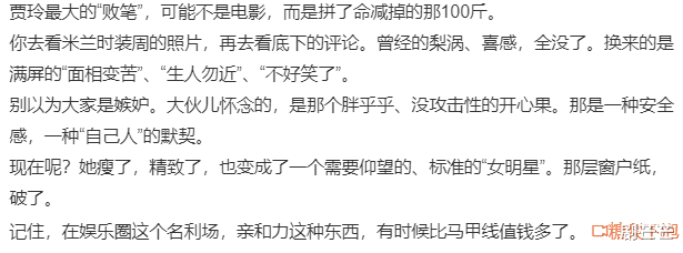 有人说,贾玲是转变为资本了,已经上桌,不需要再讨好观众,何必再费劲用外形,讨好观众博取一笑。