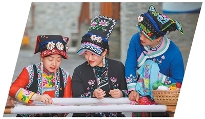 北川羌族自治县政协委员、云珍羌绣专业合作社负责人陈云珍(左一)教授羌绣技艺。 四川省政协供图