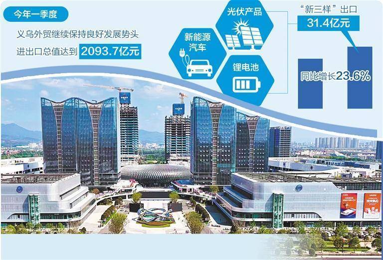 据义乌海关统计,今年一季度,义乌外贸继续保持良好发展势头,进出口总值突破2000亿元,达到2093.7亿元,创历史同期新高。其中,以光伏产品、锂电池、新能源汽车为代表的“新三样”出口达31.4亿元,同比增长23.6%。